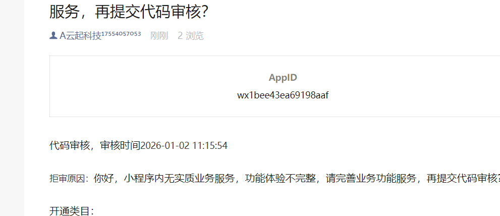 拒审原因:你好,小程序内无实质业务服务,功能体验不完整,请完善业务功能服务,再提交代码审核?