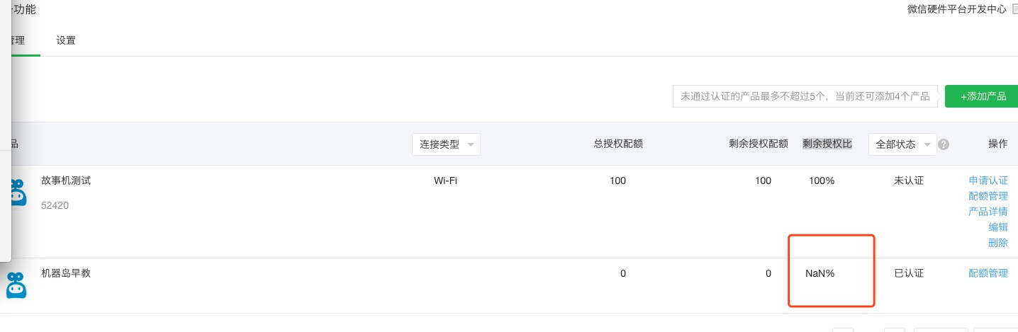 我们硬件使用微信的设备功能,申请配额上面显示NaN%。导致接口报account quota not enough错误。