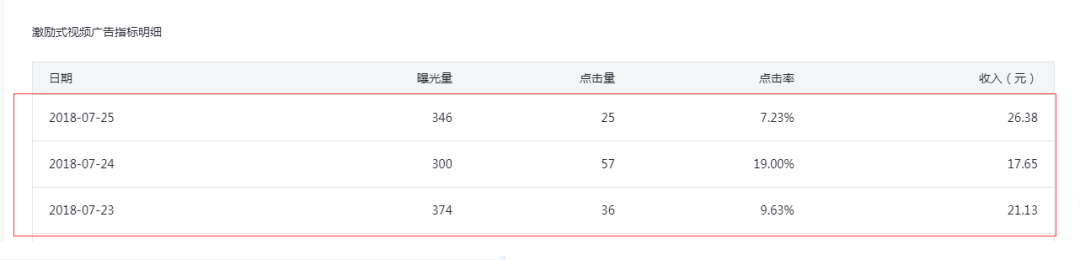 这数据耐人寻味了,25日较于23日 曝光量,点击量 点击率 均偏低,为何收入却高出23日不少,视频激励广告收入计算可否给个说明?收入 与 曝光量 点击 之间如何计算的?