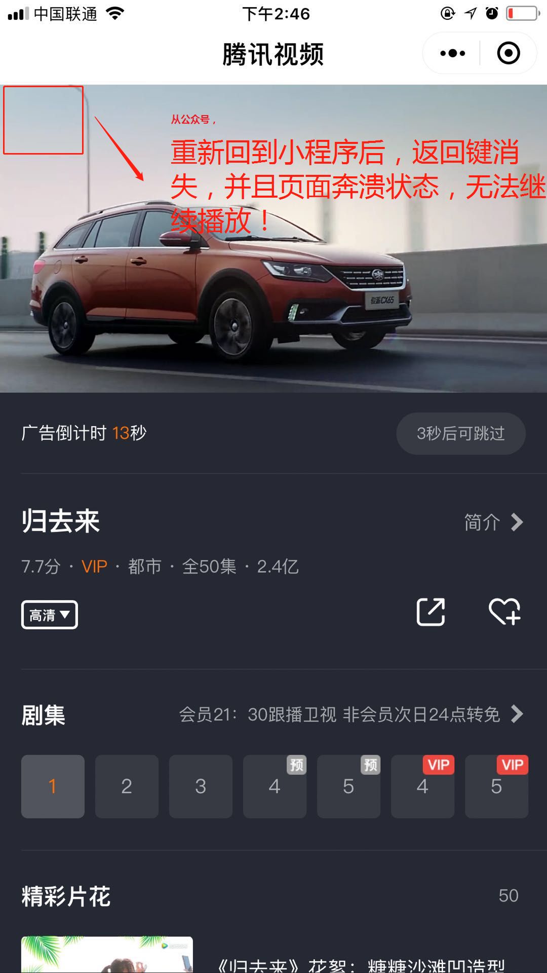 从微信小程序 去到 公众号(已关注的:第一次关注的会原路返回小程序),小程序会奔溃。退出公众号后,会直接返回到微信聊天列表,这时候再重新进入刚刚的小程序,这个小程序的返回键是消失了的,并且整个小程序页面处于奔溃状态!