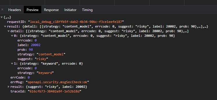 测试内容是 卖淫。 我也是很迷, 下面的errCode是0, 但是detail里面有一个suggest 是risky, 然后我测试的大部分内容errCode返回都是0, 包括, 操你妈, 你妈逼, 毒品, 卖淫,嫖娼。