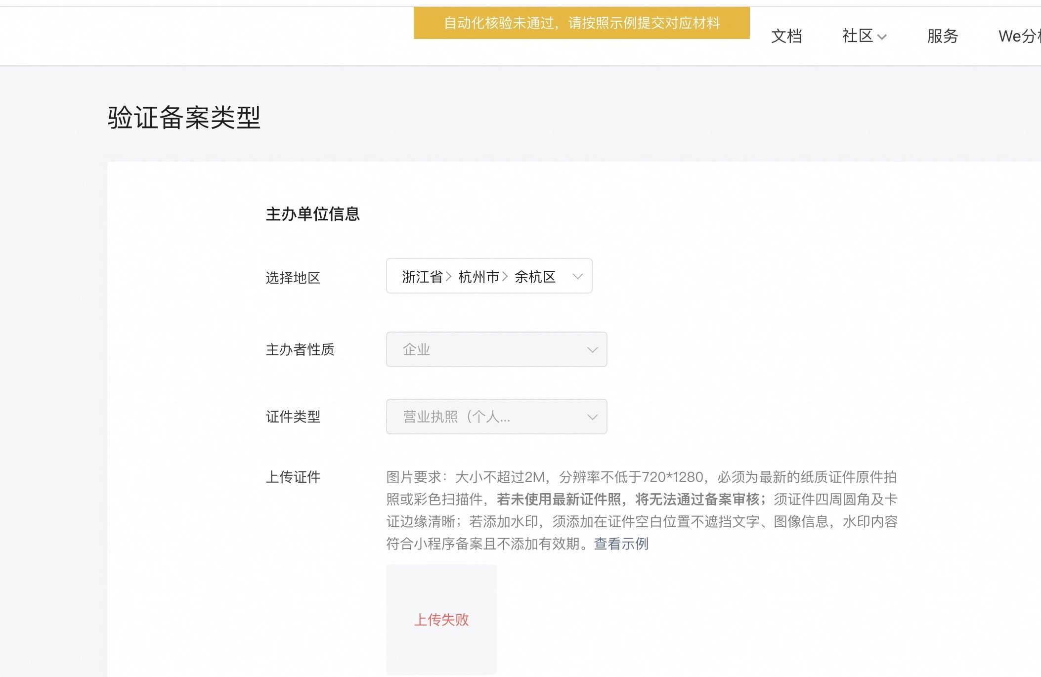小程序备案失败 上传证件1%就提示“自动化核验未通过,请按照示例提”,看了示例也没什么问题,怎么解决