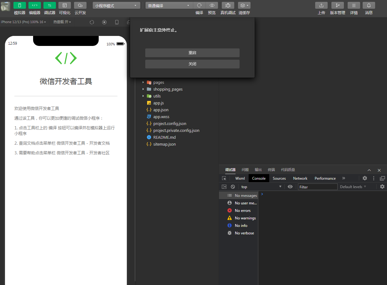 打开项目就提示扩展宿主意外终止,点击重启就会重复弹出。点击关闭项目就无反应。