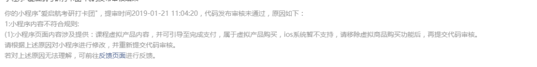 你好,经核实,贵方小程序最新提审版本暂不涉及虚拟支付,但小程序【进入课程-主题】涉及诱导分享朋友圈,涉及平台未允许的内容,请去掉该功能,修改后再提交代码审核