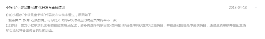你好,这个小程序是用于绑定第三方微信商城开发的小程序的,之前放到已经放到按审核结果补充选择商家自营-图书报刊/音像/影视/游戏/动漫类目,最近这一次继续审核不通过,审核的结果原因是一样的