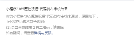 5月9号提交的第一版小程序审核通过后,5月10号对程序进行了更新,只是修改了一些bug,主要内容并没有改动,但是刚才返回审核结果不通过,理由是生成结果包含二维码。但是我们包含的是本小程序的二维码,并不是其他小程序或者其他不相关的链接,这个理由是毫无道理的啊!严重怀疑审核人员根本就没有扫码就直接主观臆断的认为我们的二维码不合适?这是完全的对开发人员工作成果的不尊重!