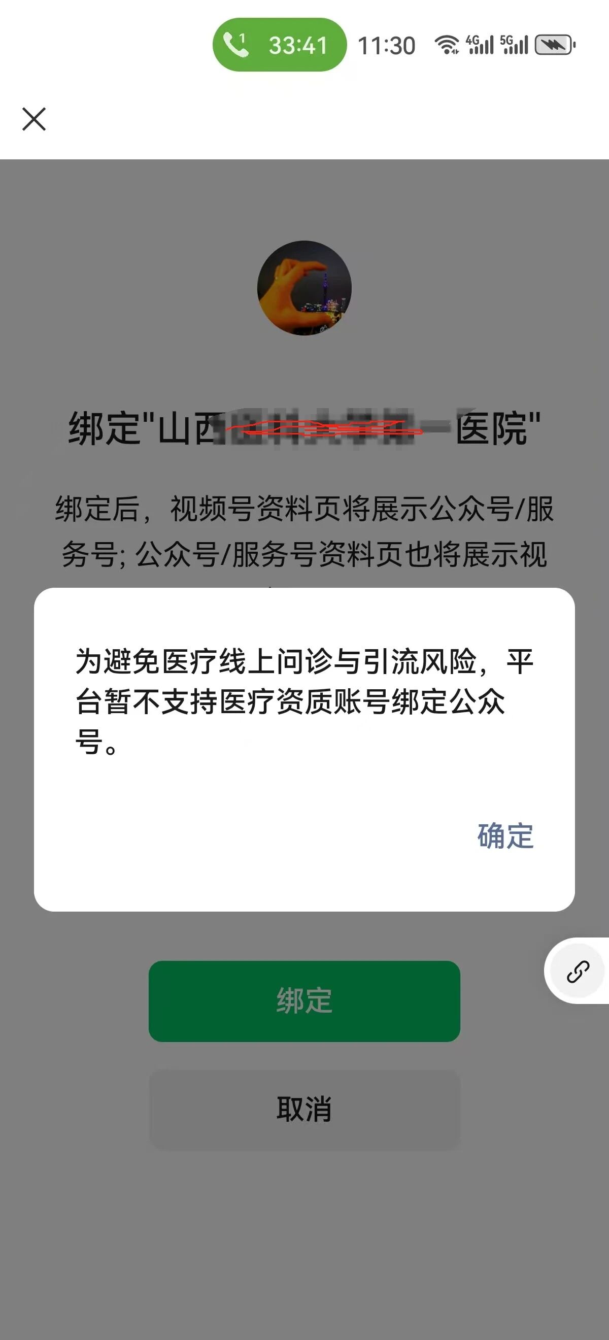 绑定“山西XX医院”视频号到“山西xx医院”公众号时。提示:为避免医疗线上问诊与引流风险,平台暂不支持医疗资质账号绑定公众号,麻烦帮忙处理,谢谢。