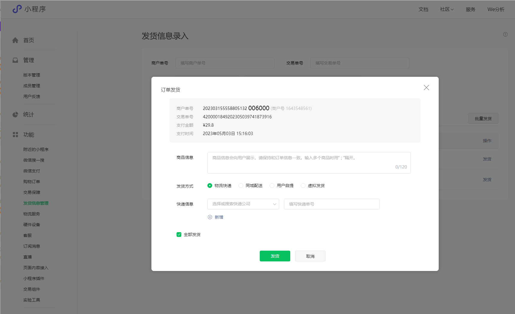 商家自营自己配送怎么填发货信息?就四个选项 三个都是物流 可是我这个小程序是商家配送怎么填写