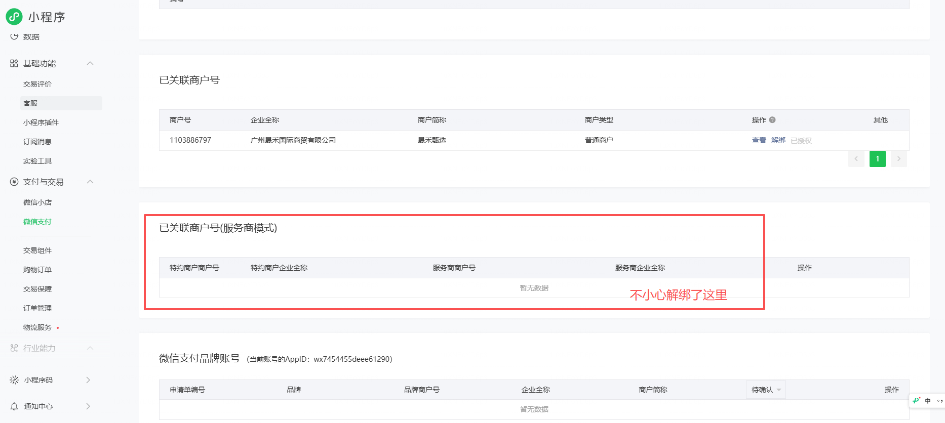 你好,不小心在这里解绑了商户号,导致小程序无法支付。也找不到入口可以重新绑定服务商模式。