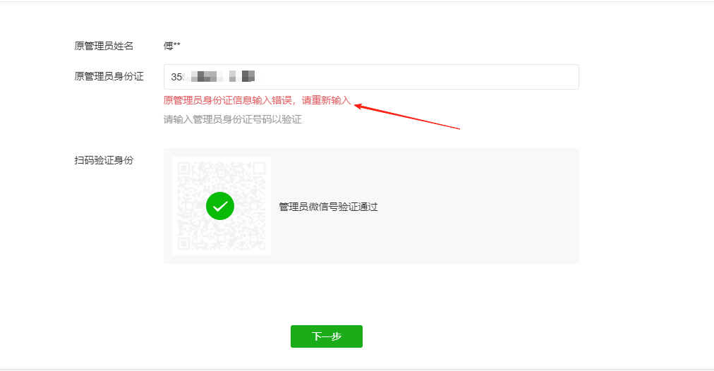 原管理员的身份证输入,老是报错。检查好多次了,也换了浏览器,换了电脑,还是同样的情况。请问是怎么回事。求求那个大神帮忙解决。不管是换主管理员,还是备案,都是显示身份证报错。姓名和身份证都是一个个输入的,错在哪里呢。很奇怪