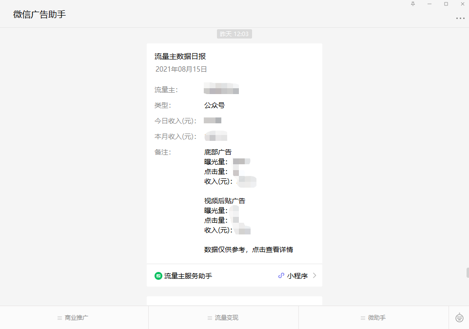 官方有个“微信广告助手”关注后流量主数据日报每天中午会更新的。