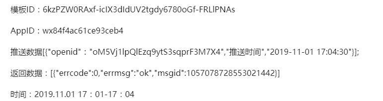 推送数据[{"openid":"oM5Vj1lpQlEzq9ytS3sqprF3M7X4","推送时间","2019-11-01 17:04:30"}];