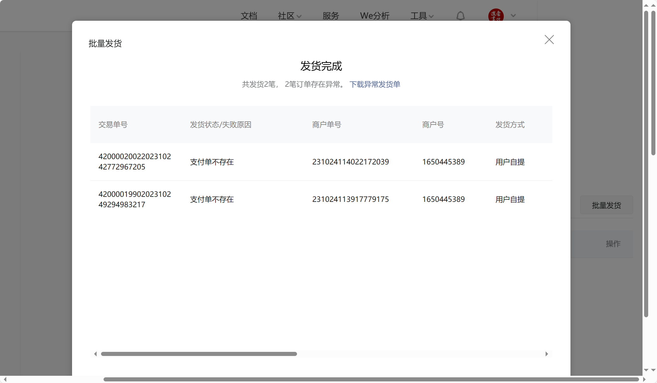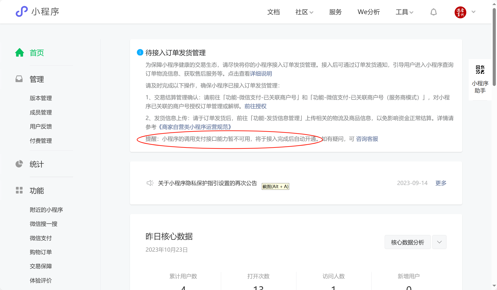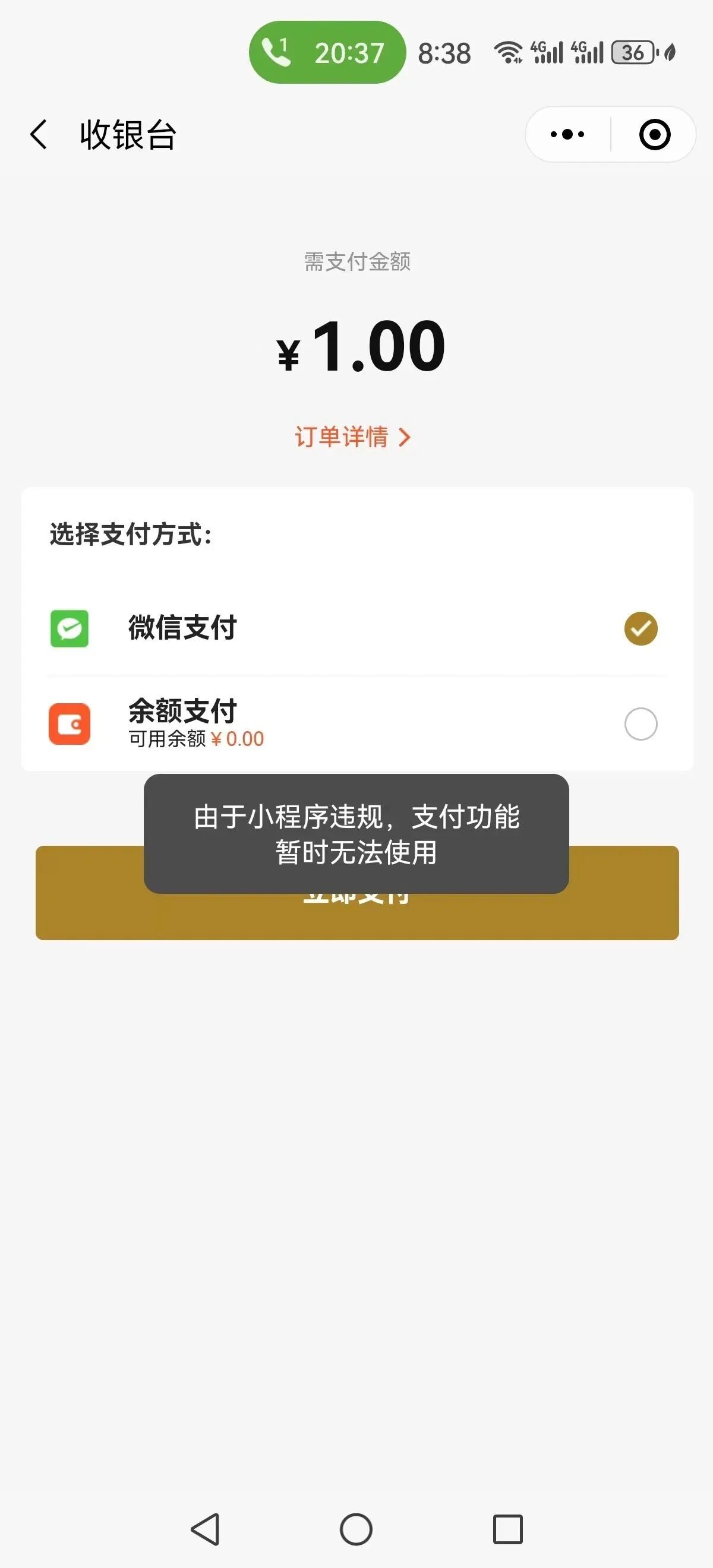 小程序支付显示的是“小程序违规,支付功能暂时不能使用”,但是登录小程序后台,却没有任何违规记录。首页发现提示【待接入订单发货管理】(提醒:小程序的调用支付接口能力暂不可用,将于接入完成后自动开通)首先将商户号进行了授权完毕,然后提交发货信息管理,就是多次提交始终显示“支付单不存在”,支付单号是由授权后的商户通过微信公众平台下单生成的,却始终显示不存在,小程序的支付功能又不能使用,没有办法下单。感觉就像进入了一个死循环里了。请高手给指定迷津,感谢至极!