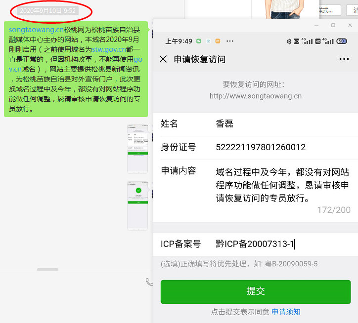 songtaowang.cn松桃网为松桃苗族自治县融媒体中心主办的网站,本域名2020年9月5日刚刚启用(之前使用域名为stw.gov.cn,在微信中打开网站或分享都一直是正常的,但因机构改革,不能再使用gov.cn域名),网站主要提供松桃县新闻资讯,为松桃苗族自治县对外宣传门户,此次更换域名过程中及今年,都没有对网站程序功能做任何调整,也详细的自查过网站的代码及各级页面,还未发现有诱导分享、关注等诱导行为内容等违规的地方,9月10日已通过图一中提供的“申请恢复访问”提交过,但至今还未收到服务通知反馈,顺便请帮忙查一下网站哪里有违规,违规URL是什么?