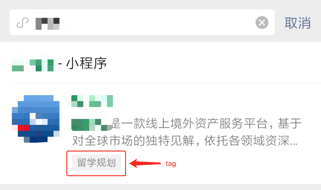 微信中根据名称搜索小程序,搜索结果下方显示tag为留学规划,确认过小程序的服务类目,分别为[工具-办公、工具-信息查询、工具-效率],所以想知道这个tag与什么有关?是否可以取消?如果可以取消的话,如何取消?小程序appid:wx9c7b2a445487b784