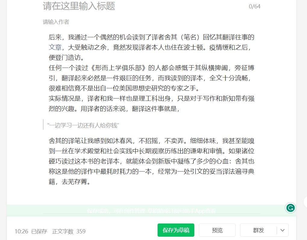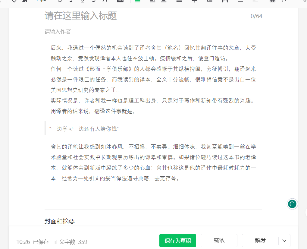 我的编辑步骤是新建图文,然后从以前发表的文章复制一个段落再修改这样。我可以把草稿发给你们,