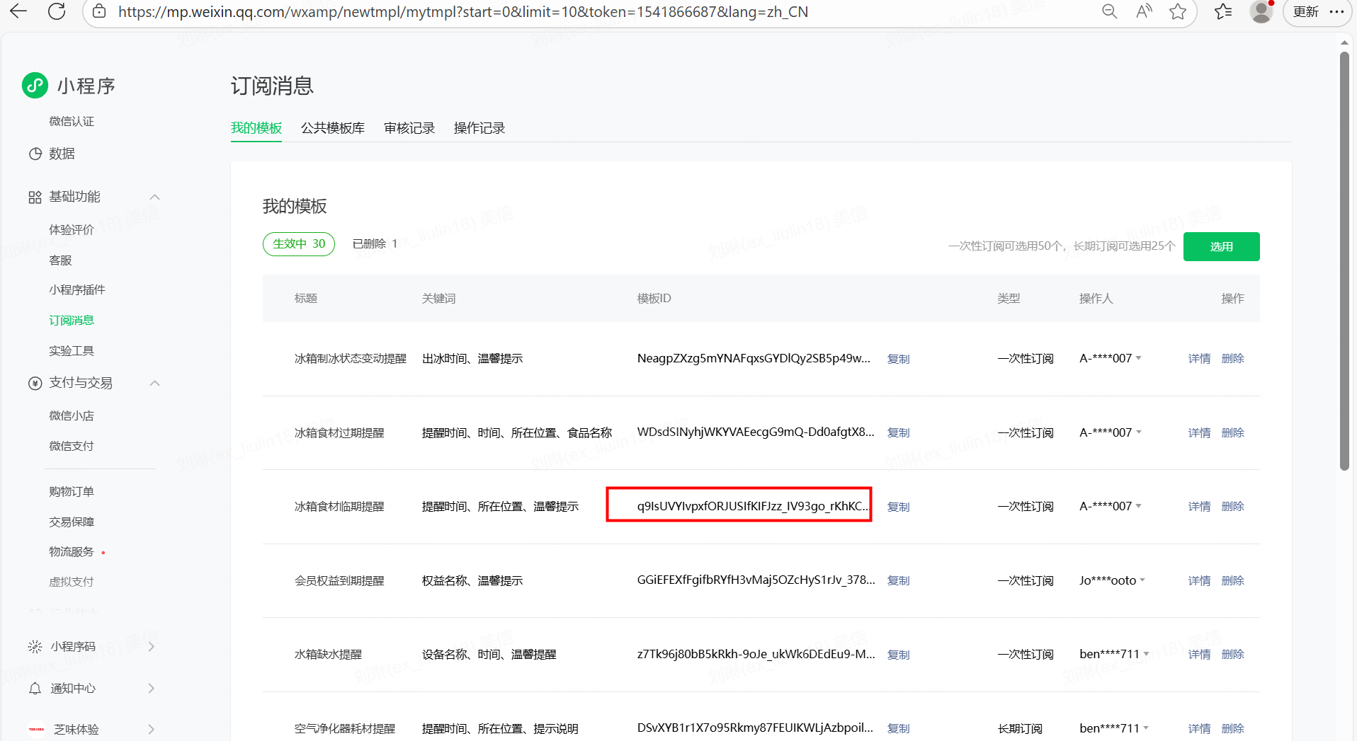 你好,日志查看调用的是/cgi-bin/message/device/subscribe/send接口确认一下模板ID是不是设备ID,提供下后台模板ID界面完整的截图