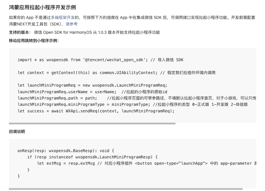 补充一下官网的空白 /** * 拉起微信小程序 */ async LaunchMiniProgram(){ // WXApi 是第三方app和微信通信的openApi接口,其实例通过WXAPIFactory获取,需要传入应用申请到的AppID const WXApi = wxopensdk.WXAPIFactory.createWXAPI(APP_ID) let req = new wxopensdk.LaunchMiniProgramReq req.userName = "小程序的原始id号" //小程序的原始id,必填 let finished = await WXApi.sendReq(getContext(this) as common.UIAbilityContext, req) console.log("send request finished: ", finished) }在最新版本SDK已经有了小程序拉起的相关API,很不稳定不确定是sdk的问题还是微信版本的问题,官方文档还没出来应该还没交付稳定版本。