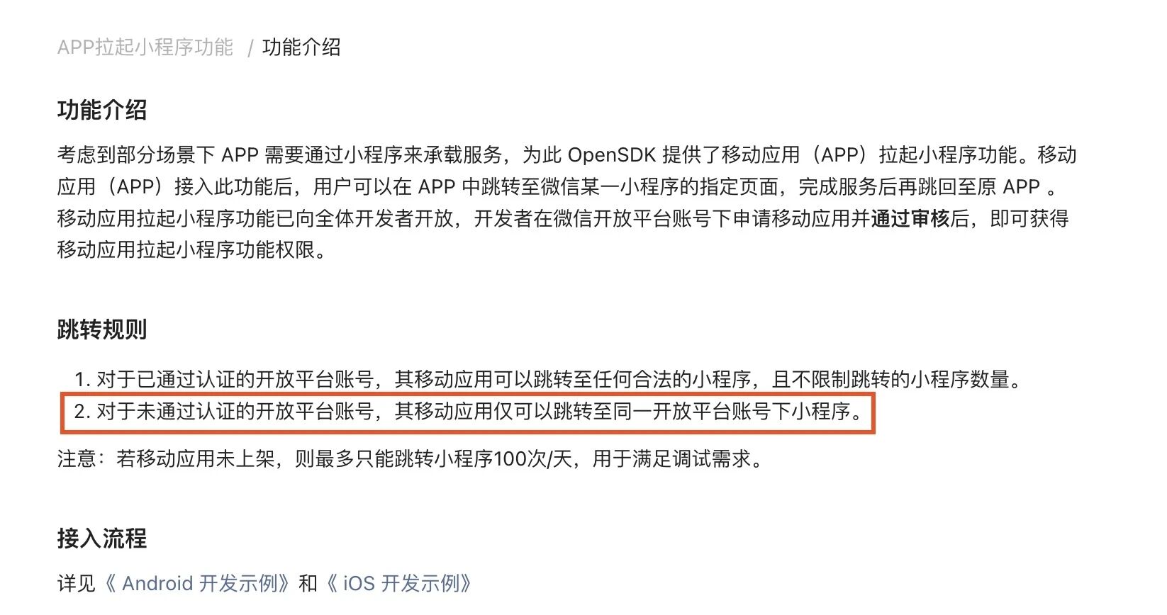 有可能是这个原因:对于未通过认证的开放平台账号,其移动应用仅可以跳转至同一开放平台账号下小程序。未认证的开放平台账号,申请的APPID对应的应用,是不具备跳转任意小程序的,所以显示跳转失败。