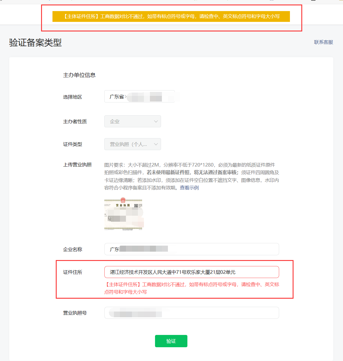 小程序备案,在【验证备案类型】界面下的【证件住所】一直提示“【主体证件住所】工商数据对比不通过,如带有标点符号或字母,请检查中、英文标点符号和字母大小写”的信息,但是截图文中填写的都是中文及数字,并未包含标点或特殊符号,麻烦检查下代码是否有bug?