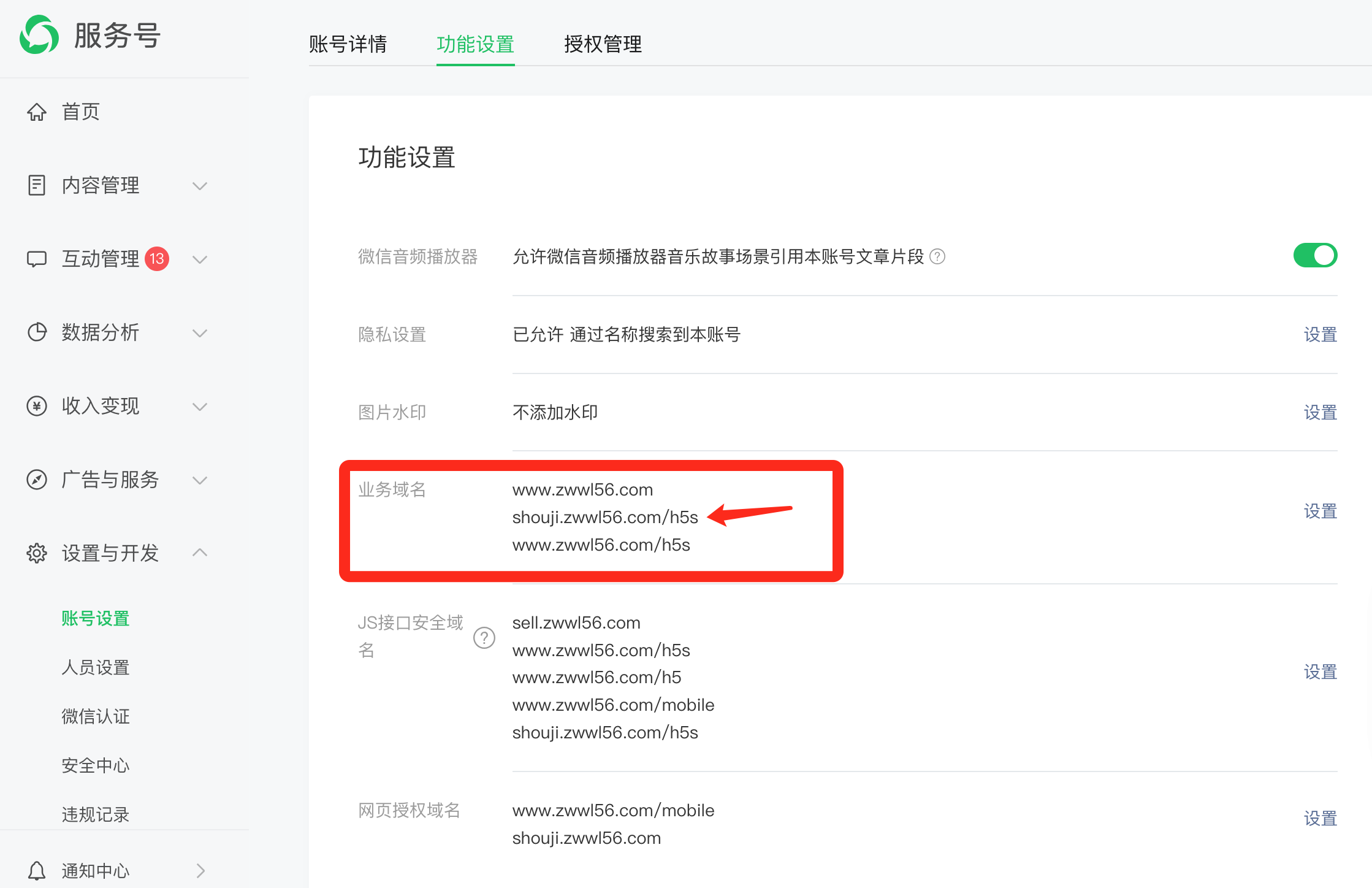 请站长放开整个页面链接,不是某一个链接(订单太多,链接参数各不相同),是整个页面,或整个域名下的网页(我们在服务号下设置了业务安全域名)。