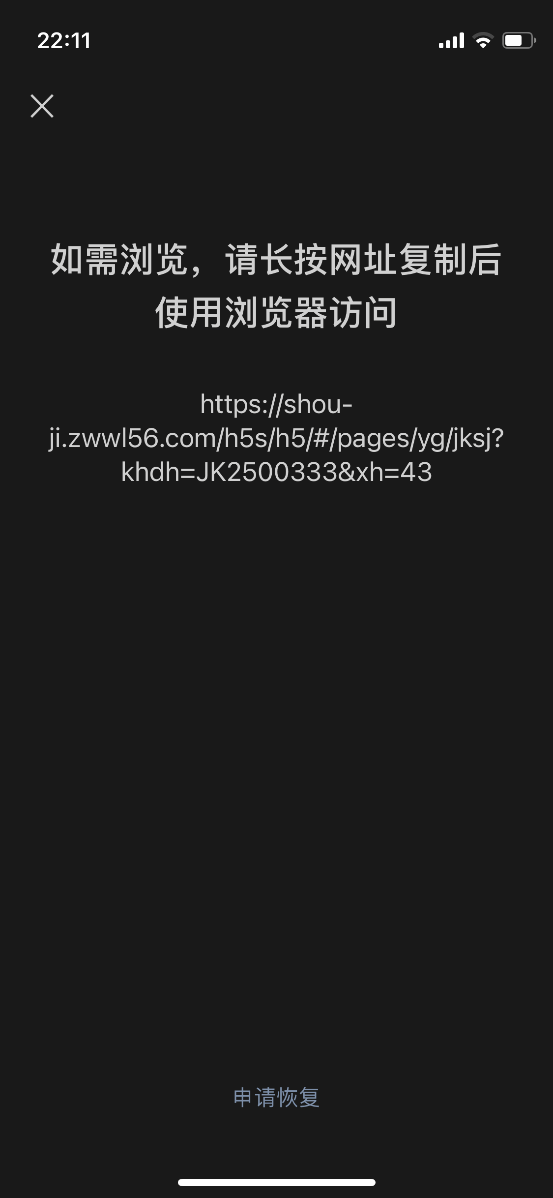 链接举例:https://shouji.zwwl56.com/h5s/h5/#/pages/yg/jksj?khdh=JK2500333&xh=43,44,45
