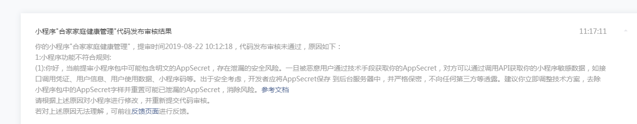 审核好几次,审核结果是可能包含明文的AppSecret,存在泄漏的安全风险。文件里面也没有appsecret的,可以给出具体的页面嘛