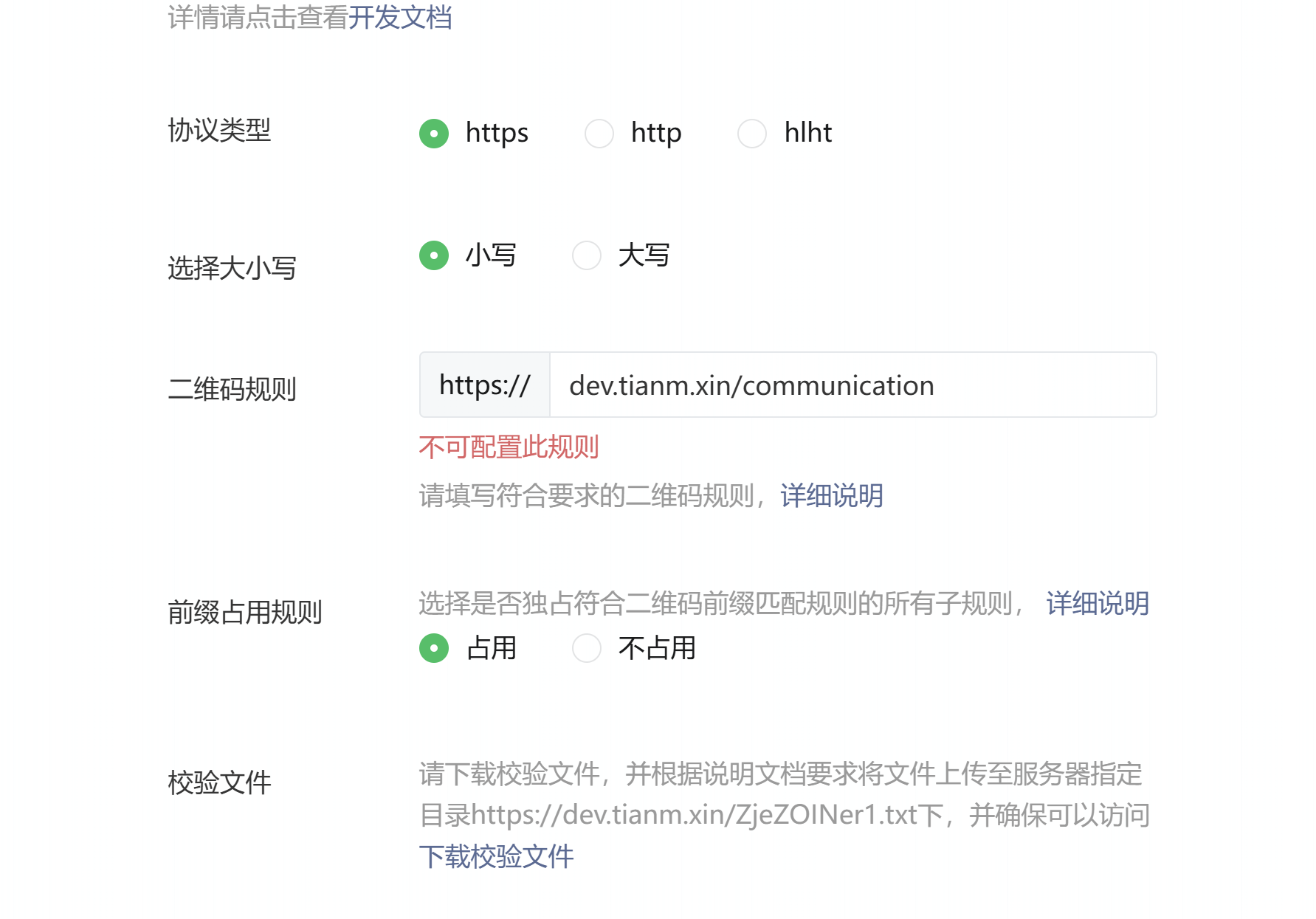 配置普通链接二维码规则时候,总是提示不可配置此规则;该域名已经配置了业务域名,且已经备案;具体见截图。请帮忙看看解决