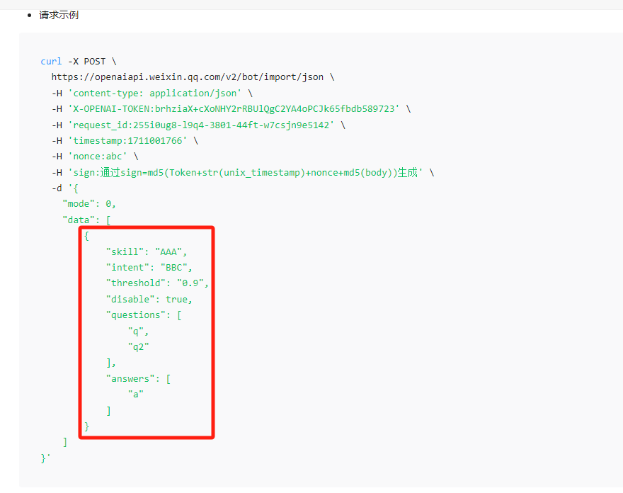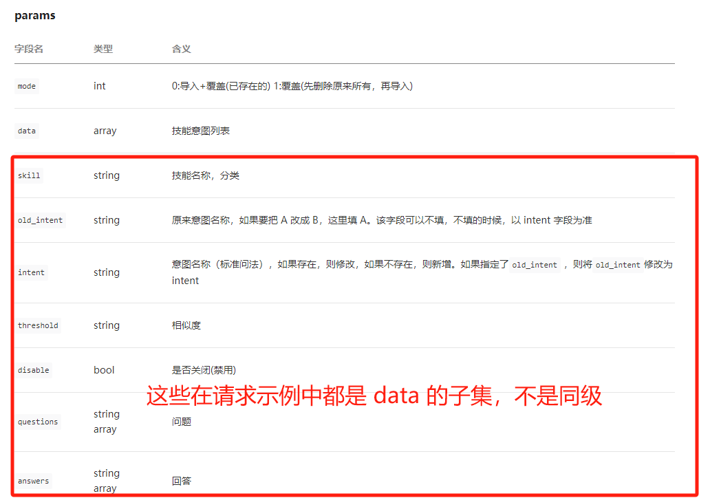 另外文档中的请求参数和请求示例中的结构不一致。如下图,请求参数中的 skill、intent 等和 data 都是同级,但示例中都是 data 的子集。这里是不是应该写成 data.skill,data.intent,避免误解?
