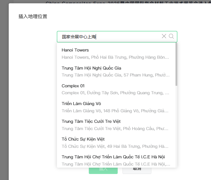 插入地理位置时,找不到想要搜索的地方,并且出现的都是其他国家的文字