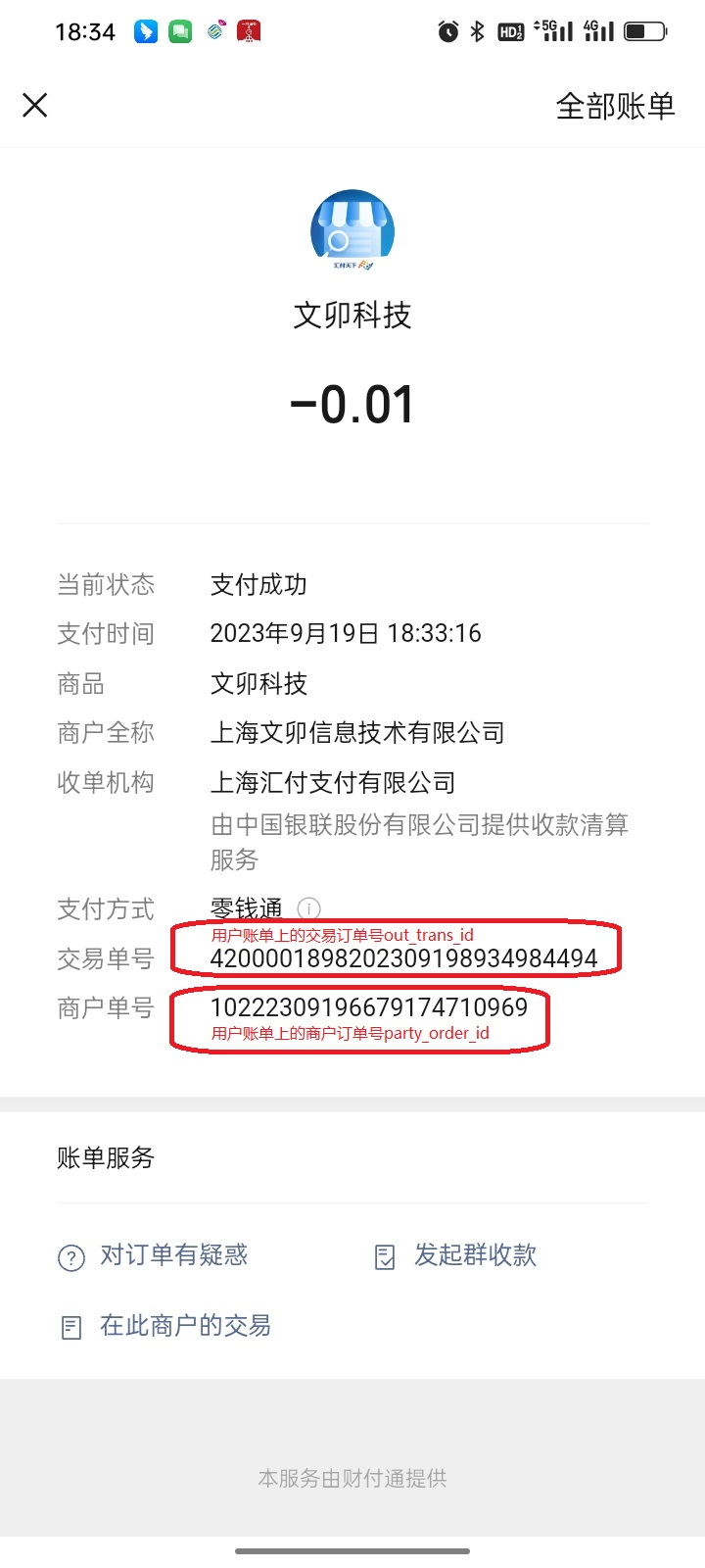 微信小程序使用第三方支付--汇付支付,调用发货信息录入接口,order_number_type值为2,transaction_id值为汇付回调返回的out_trans_id的值,微信端提示支付单不存在({"errcode":10060001,"errmsg":"支付单不存在 rid: 68108fba-3b4cb16d-382db425"})