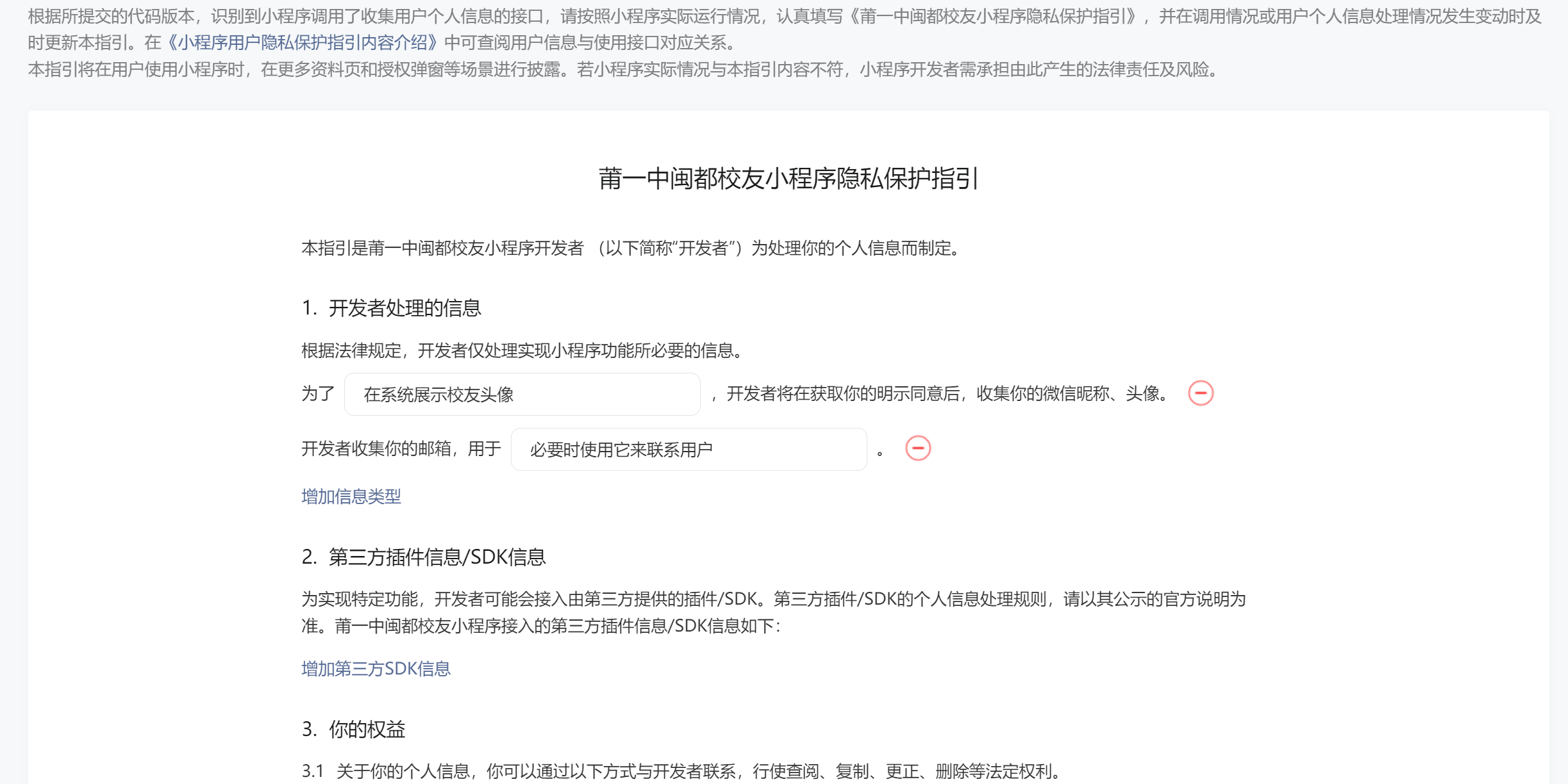 用户隐私保护指引设置时,填完所有数据,点击确定并生成协议后,这时显示的协议是正确的,如下图