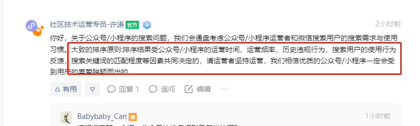 你好,关于公众号/小程序的搜索问题,我们会通盘考虑公众号/小程序运营者和微信搜索用户的搜索需求与使用习惯。大致的排序原则:排序结果受公众号/小程序的运营时间,运营频率,历史违规行为,搜索用户的使用行为反馈,搜索关键词的匹配程度等因素共同决定的,请运营者坚持运营,我们相信优质的公众号/小程序一定会受到用户的喜爱脱颖而出的。