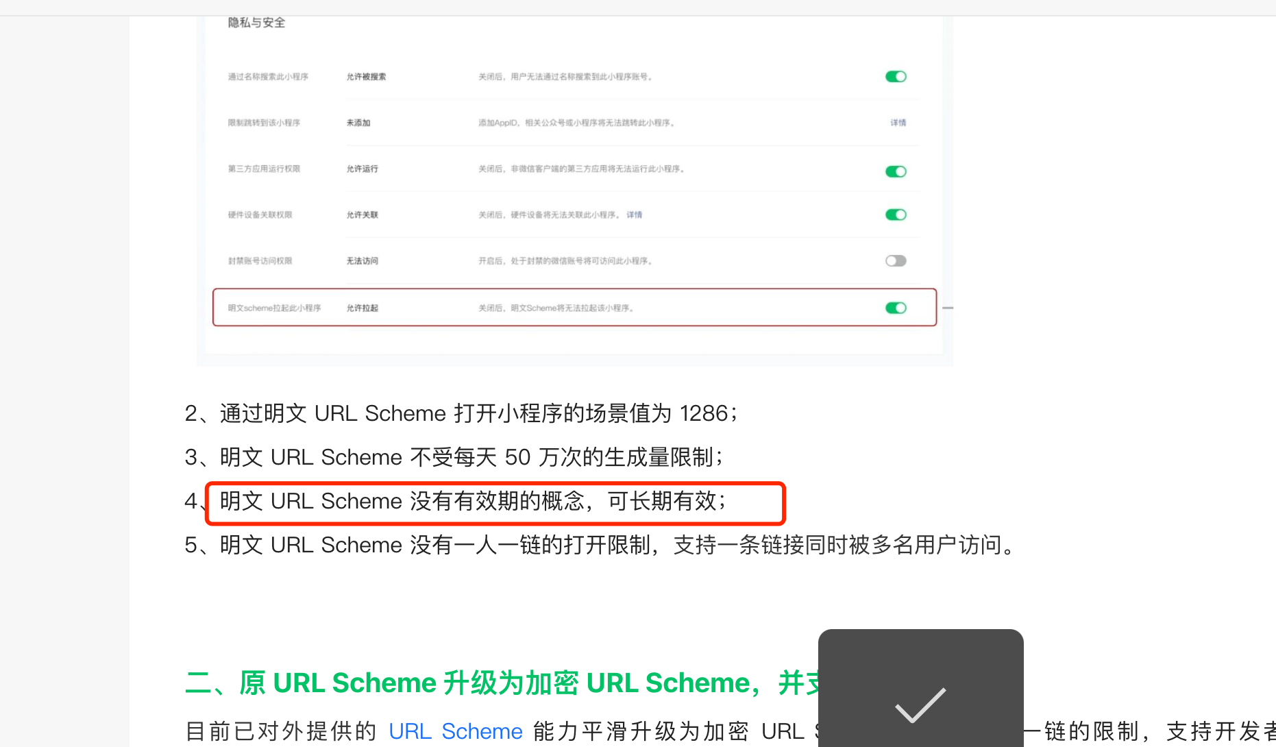 大佬们,问个问题 小程序 配置生成的 明文 URL Scheme 是永久的吗,看最新文档[2023年]很含糊没说多长时间, [2022年]说是30天 , 我想把URL Scheme 生成二维码,通过扫描二维码进入小程序指定页面 , 有知道的吗
