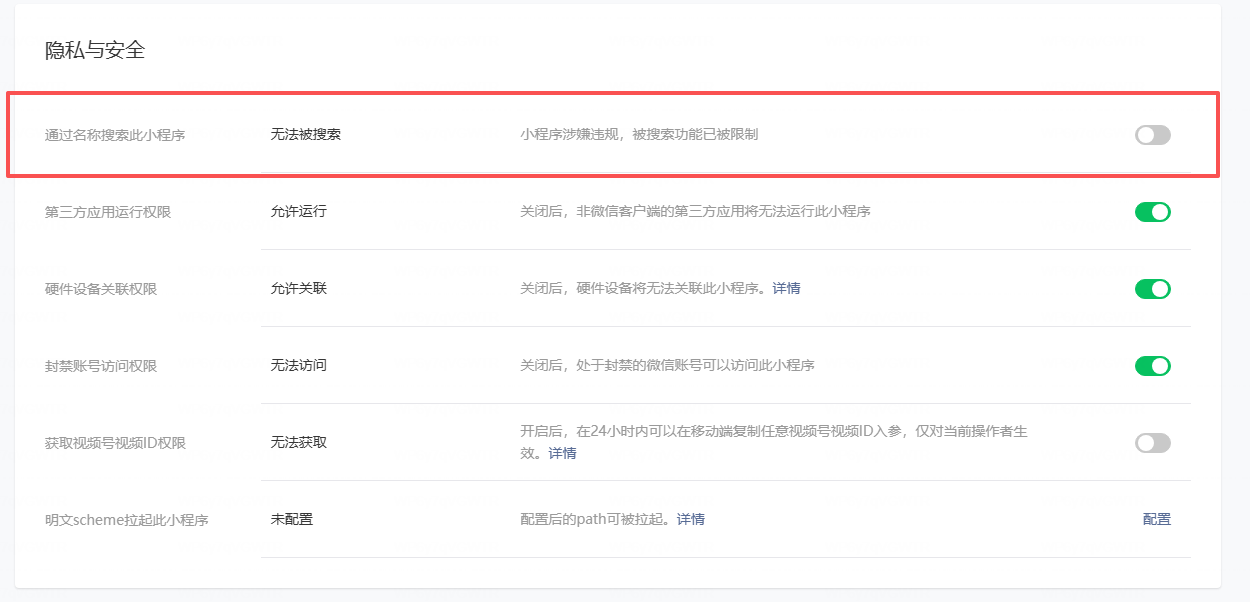 之后查看设置之后才发现,名称搜索点不开。请问是什么原因?小程序备案正在审核中,跟小程序备案有关系么?