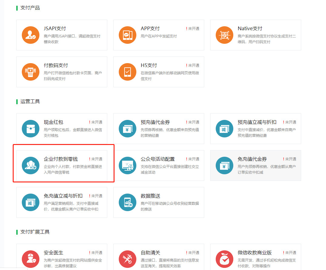 最近项目需要做企业付款到零钱和企业付款到银行卡,登录支付平台后发现只有付款到零钱的申请,请问企业付款到银行卡该如何申请呢?