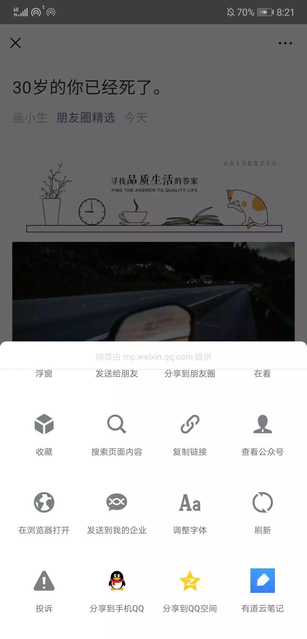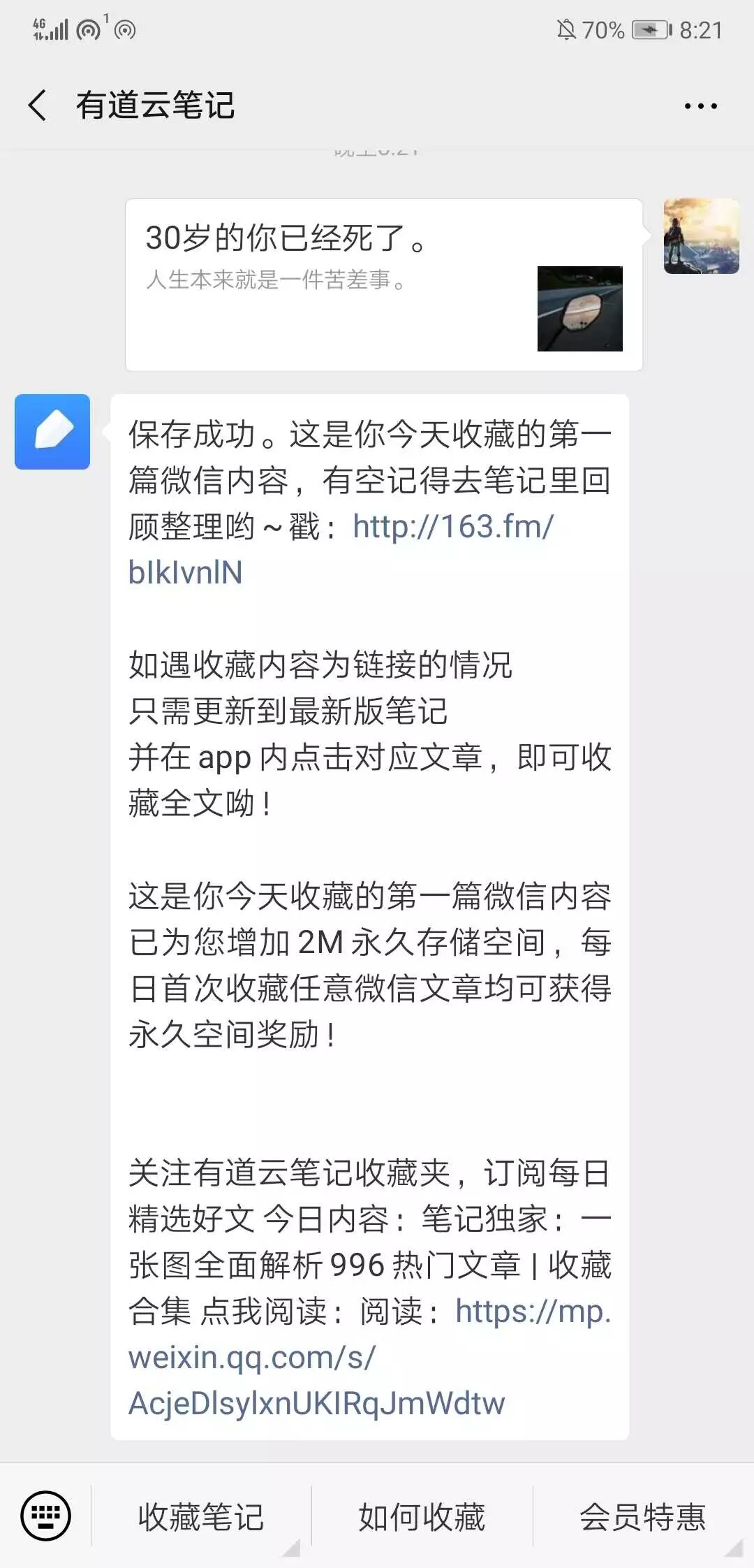 3.点击有道云笔记,提示已保存,进入有道云笔记公众号,可看到刚保存的文章: