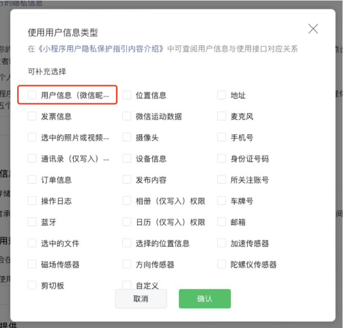 你的小程序是否有在[mp后台 -> 设置 -> 服务内容声明 -> 用户隐私保护指引]中声明【收集你的昵称、头像】呢?