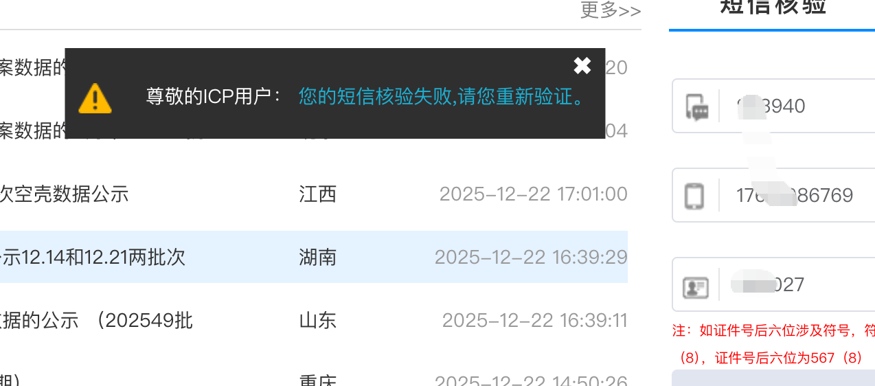 管局短信核验,证件后六位填的是负责人的证件还是法人的证件呀。确认证件后六位是正确的,现在输入负责人的提示填入法人的提示:一直这样循环好几天了求助