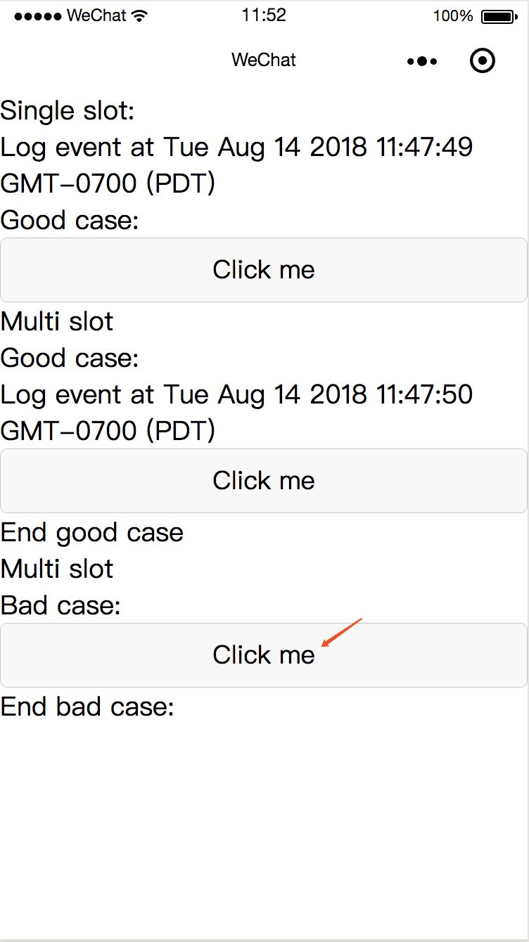 如代码片段所示,在最后一种特定情况下,事件监听失效了。也就是说点击“Click me”无法在console.log打出日志,页面也不会有显示