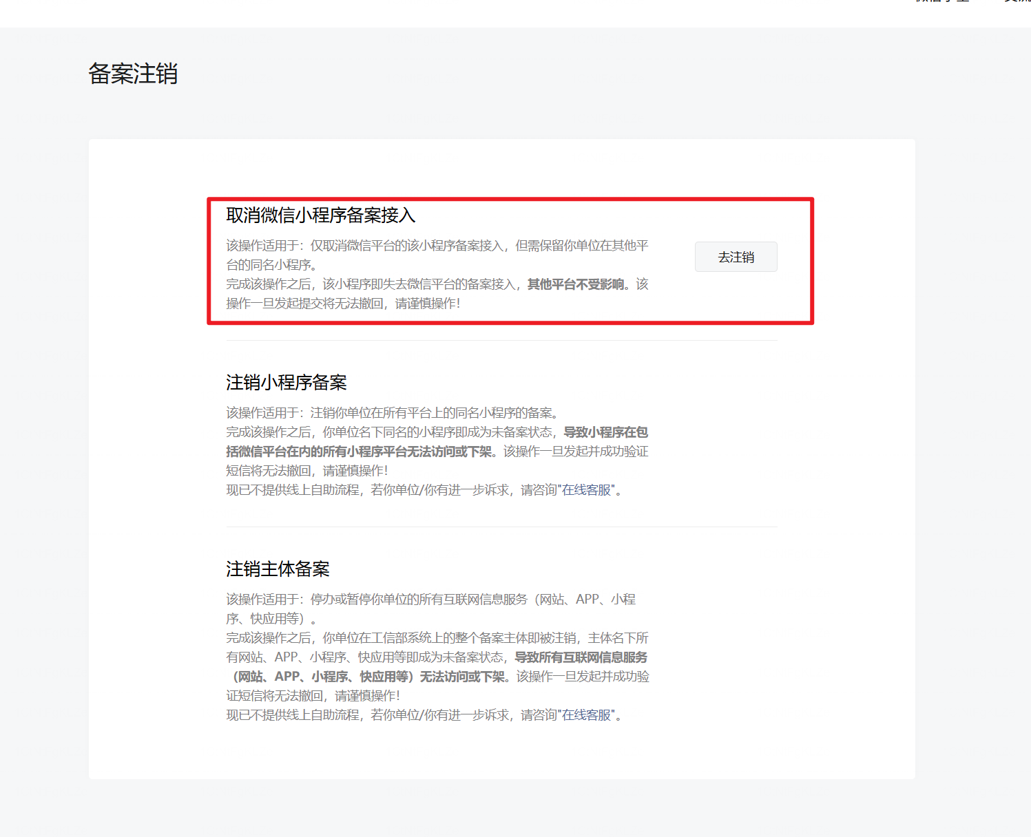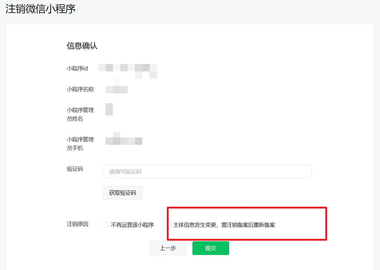 2、主体变更后,只能先注销原主体下该小程序备案信息,再用新主体提交该小程序备案信息;