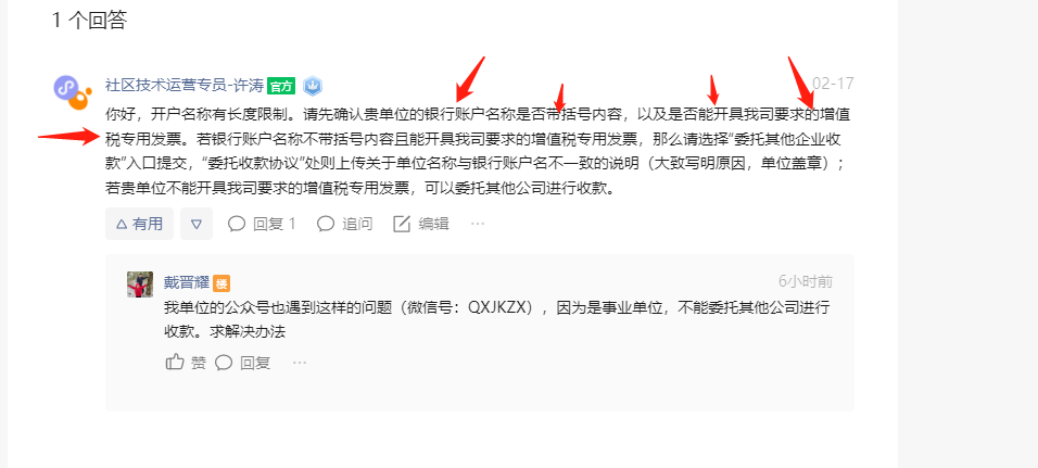 你好,开户名称有长度限制。请先确认贵单位的银行账户名称是否带括号内容,以及是否能开具我司要求的增值税专用发票。若银行账户名称不带括号内容且能开具我司要求的增值税专用发票,那么请选择“委托其他企业收款”入口提交,“委托收款协议”处则上传关于单位名称与银行账户名不一致的说明(大致写明原因,单位盖章);若贵单位不能开具我司要求的增值税专用发票,可以委托其他公司进行收款。