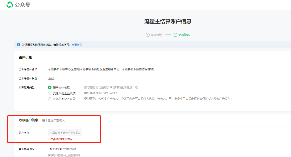 在提交“流量主结算账户信息”时,显示收款账户信息-开户名称长度超出范围,这个如何解决?开户名称是默认的
