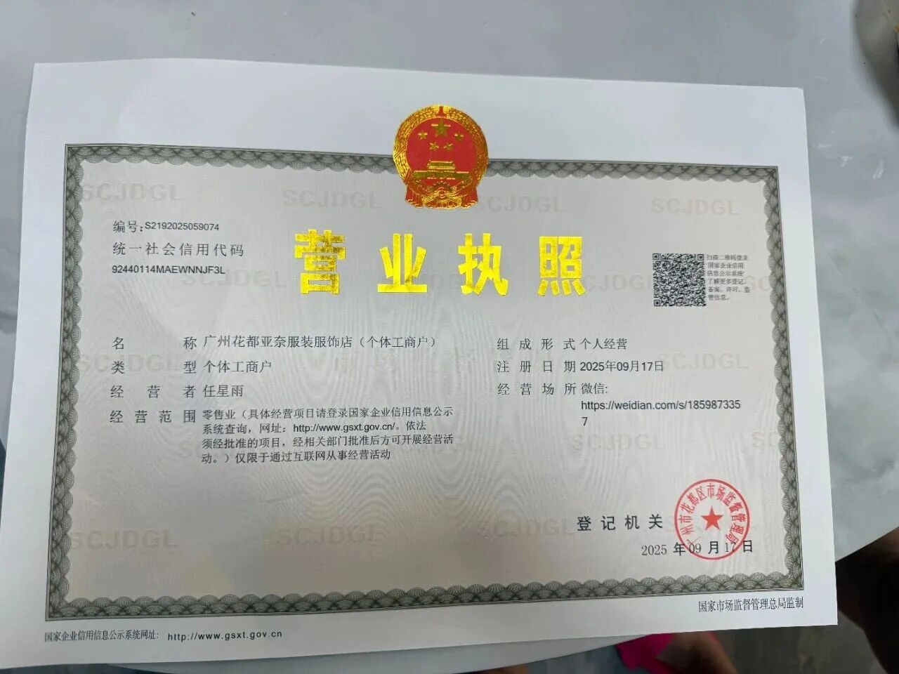 这个营业执照是网店,地址是:微信:https://weidian.com/s/1859873357