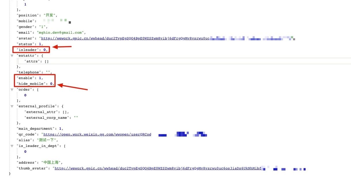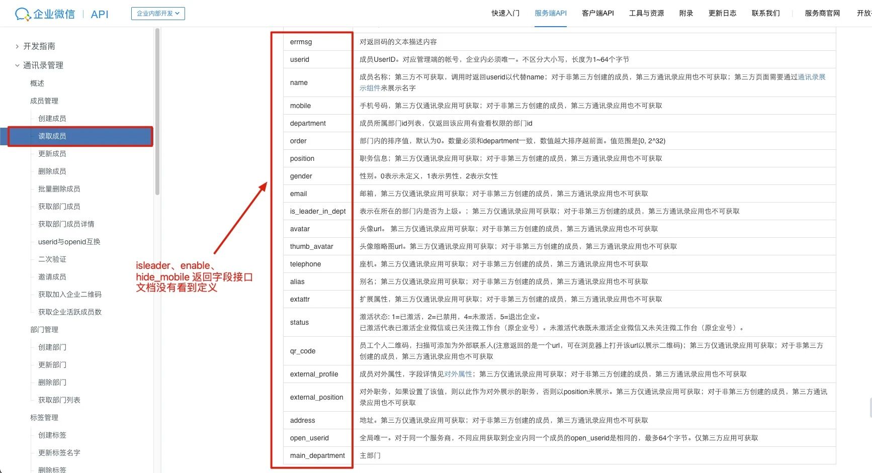 你好,isleader和hide_mobile是已经废弃了的字段,不要过分依赖,enable字段在读取成员这里是漏了可能,我们加一下