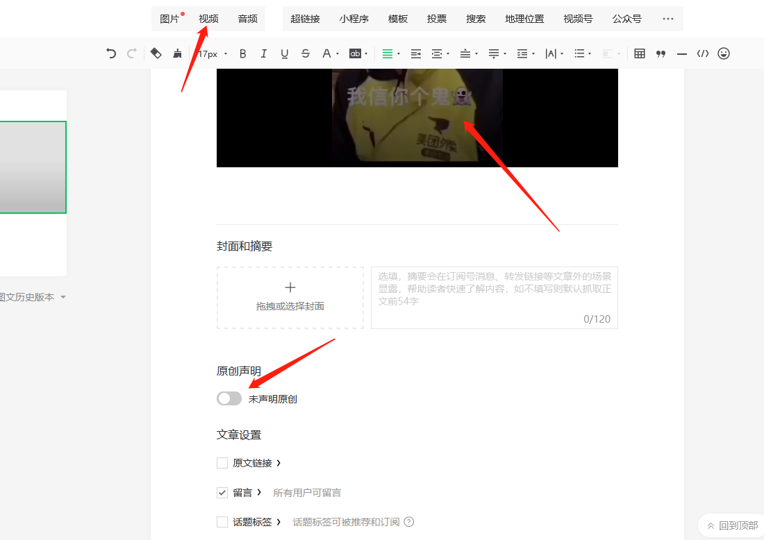 新建一个图文草稿,然后插入视频,最后勾选原创