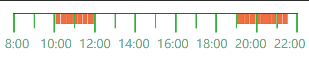 画了一个时间刻度条,5分钟一个刻度,每个刻度设置的宽度为4rpx,14个小时共有169个刻度共676rpx,使用for循环进行遍历,在设定时间内就显示橙色,整时刻度为绿色并始终显示,其他时间就不显示颜色。