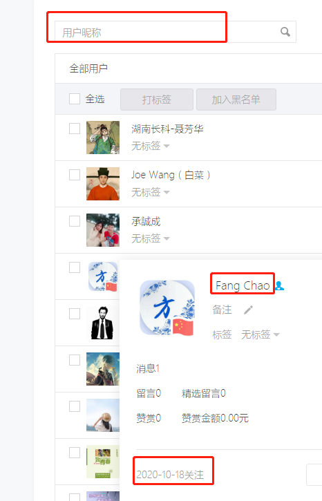 这里举一个例子,这个用户关注我公众号3天了,在用户管理输入用户昵称,搜索不到。
