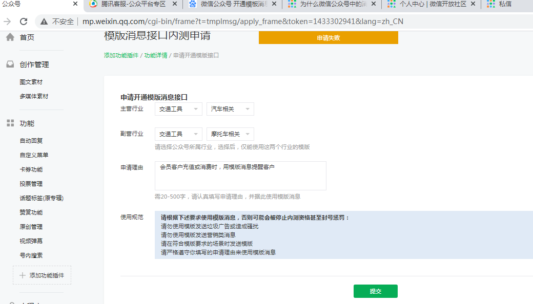 公众号是服务号,已经认证通过,但申请开通模版消息,一直提示 【申请失败】是不是一个bug? appid: wx2b0ec4f84a19c4ff 来回折腾20天了。快奔溃了。 我有其他的公众号,基本都市申请成功,没有提示。