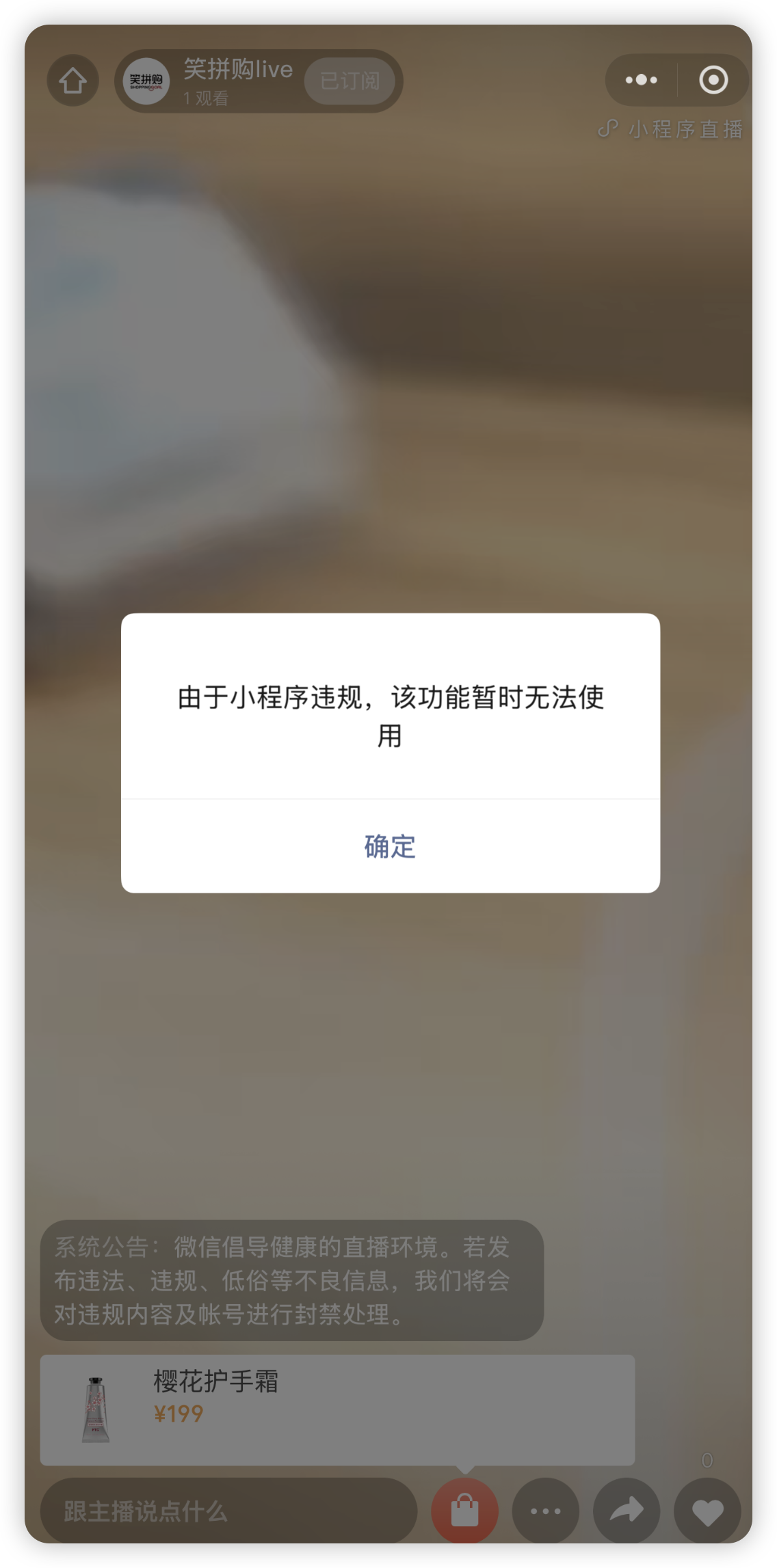 - 场景一(直播间): 在【小程序直播】插件中挂载第三方小程序商品,用户点击商品欲跳转购买时,弹出提示“由于小程序违规,该功能暂时无法使用”。
